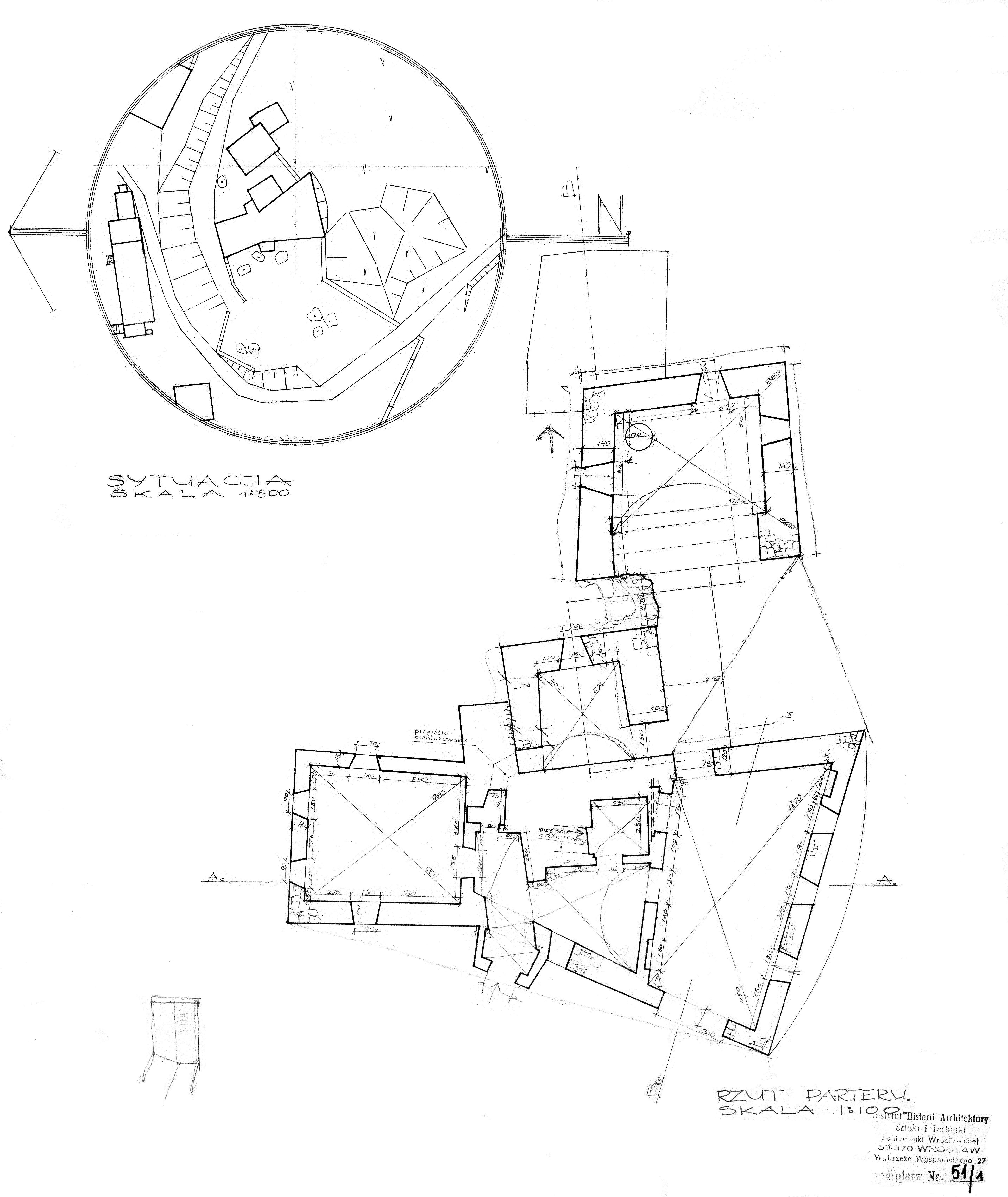 Opis:Skala 1:100 - rzut parteru ; Skala 1:500 - sytuacja