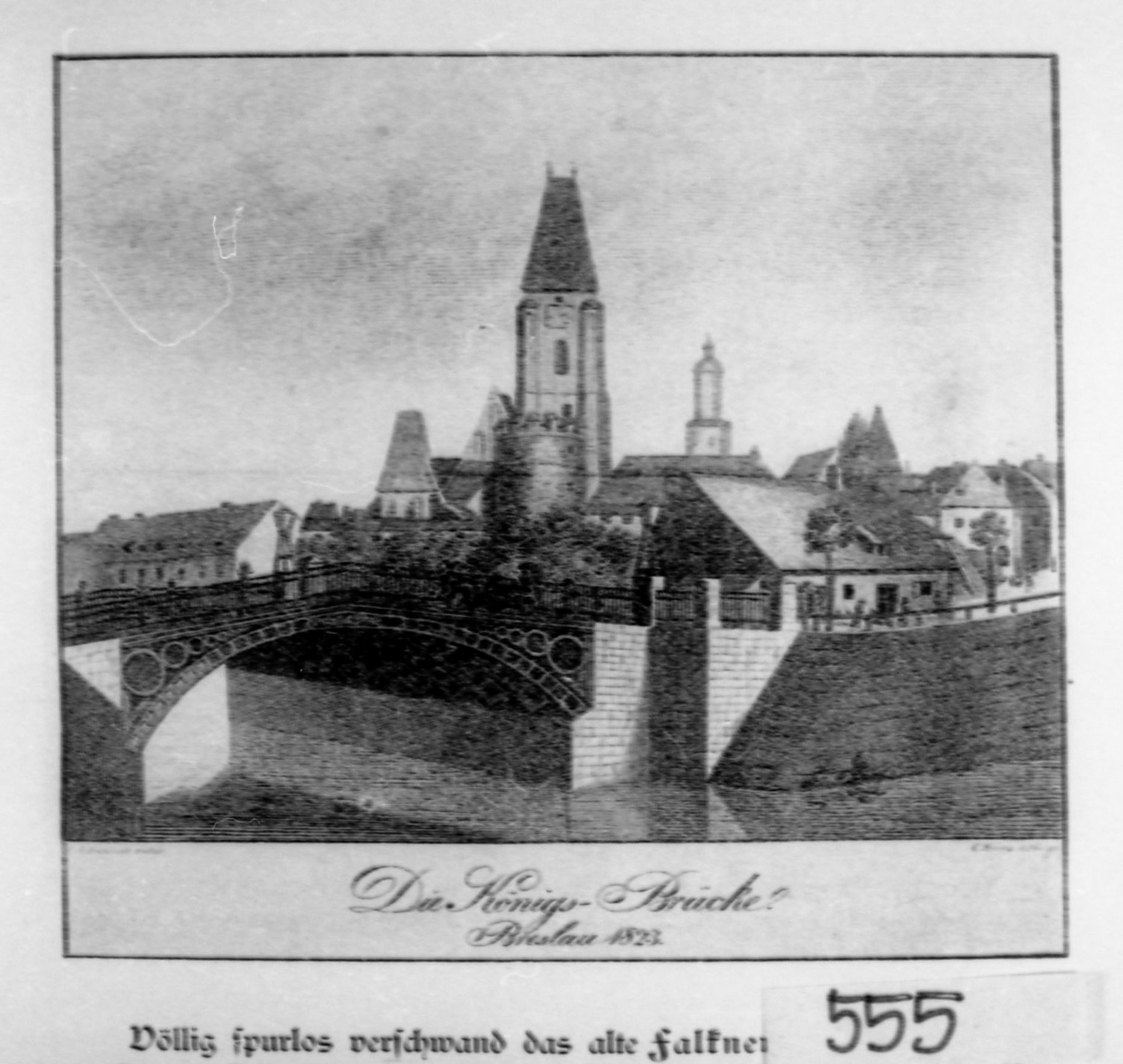 Opis:Oryginał Zakład Narodowy im. Ossolińskich ; Die Königs-Brücke. Breslau 1823 ; Weiss, F. G. A., Wie Breslau wurde, Breslau 1906, s. 7